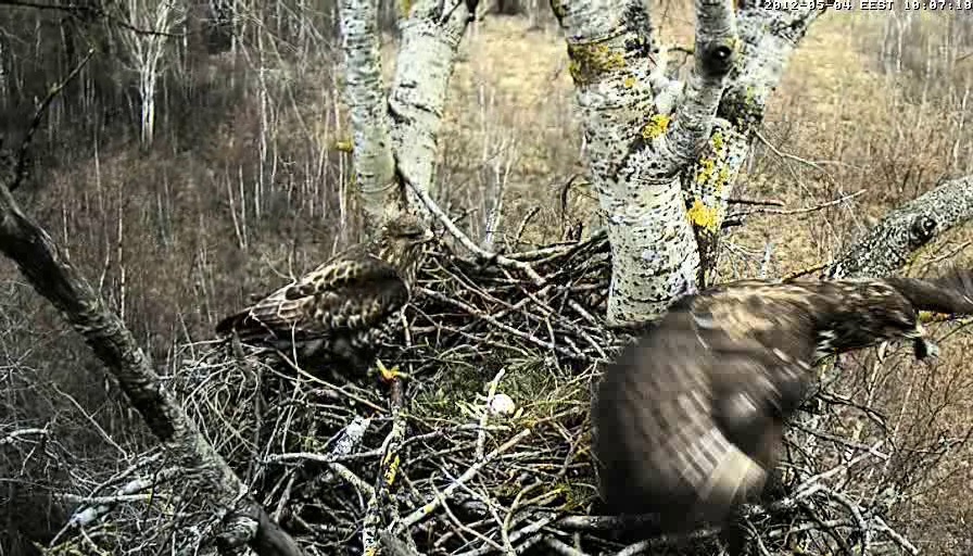 Tēviņš iekārtojās uz olas perēšanu uz dažām minūtēm, tad aizlidoja, un pēc minūtes mātīte jau bija atpakaļ.