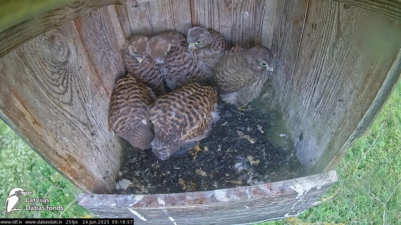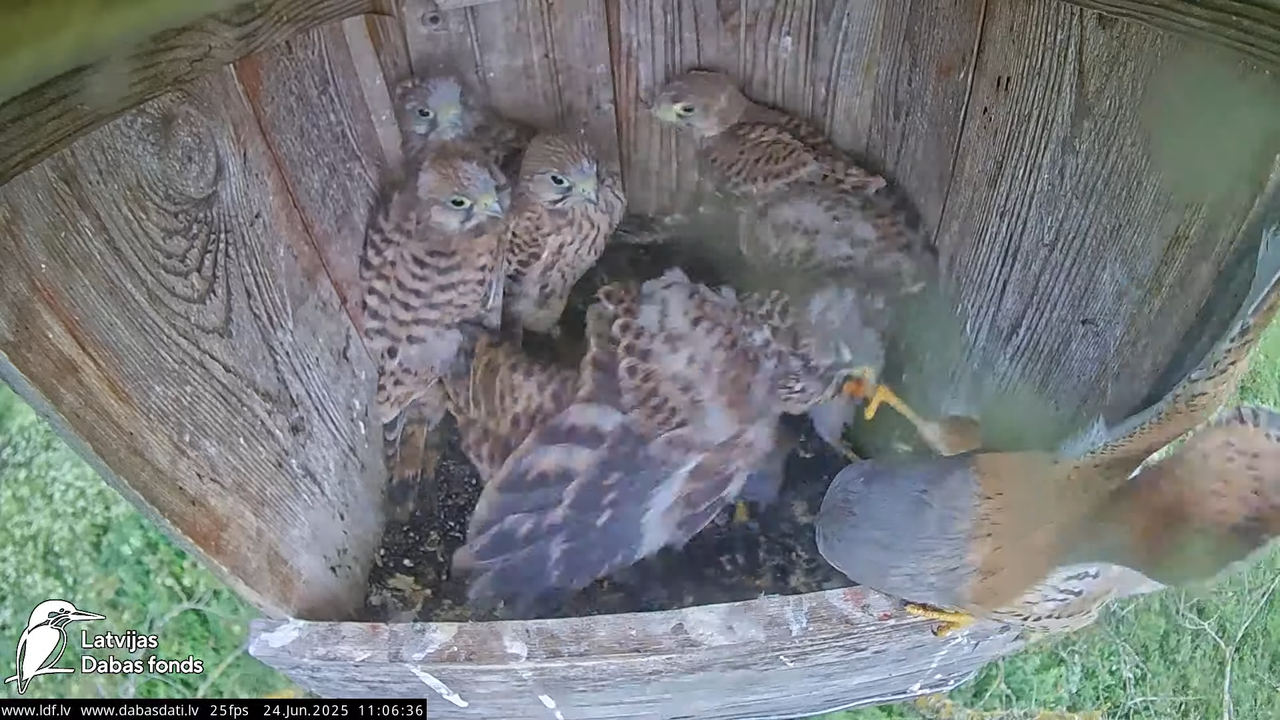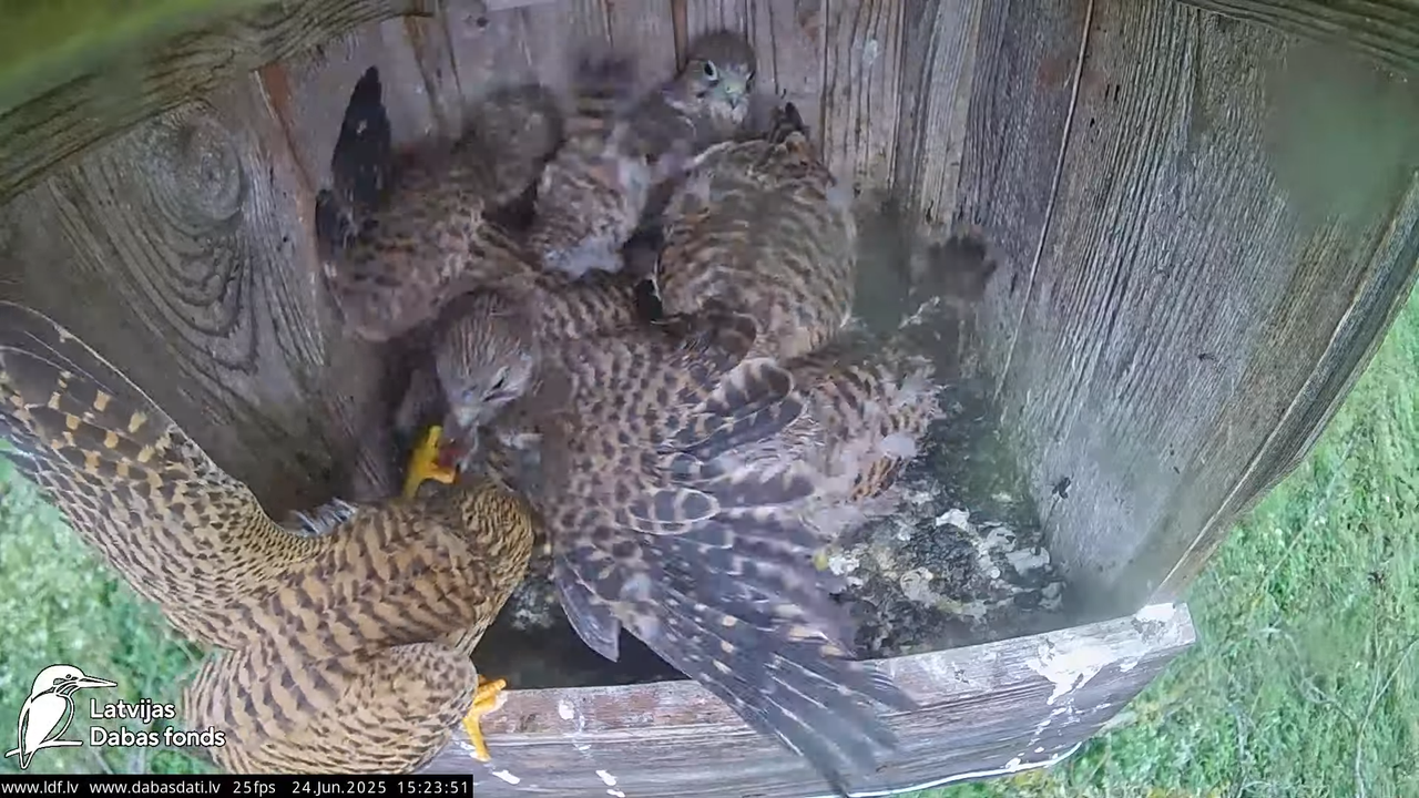 No 20:25 mājiņā atgriežas rosība - piekūnēni plivinās, reizēm pat tandēmā un kāpjot uz slieksnīša