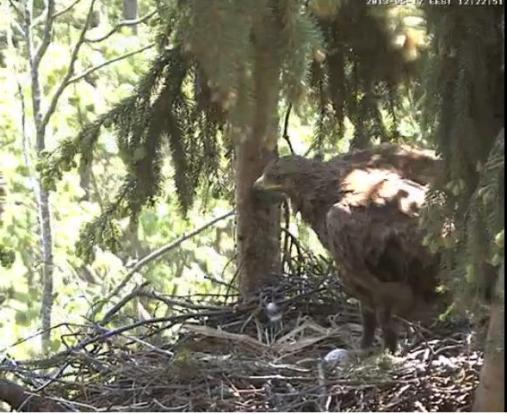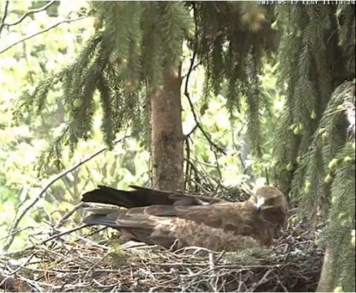 15:48 Mētra sāk klaigāt tuvumā. 15:50 Mētra beidzot ligzdā, knābī zariņš. Mačo ir pacietīgi dežūrējis ligzdā vairāk nekā 2 stundas!