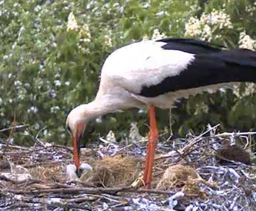 Nu jau ligzdā vairs tikai 3 mazuļi. Pieaugušais stārķis vienu mazo esot nobeidzis.