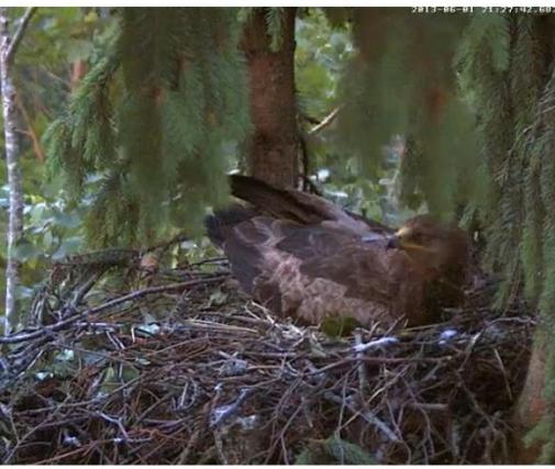 20.20 Mētra prom. Ligzdā vien vīd divas spalvas. Olas glīti piesegtas ar egļu zariņu.