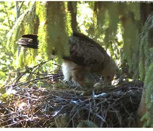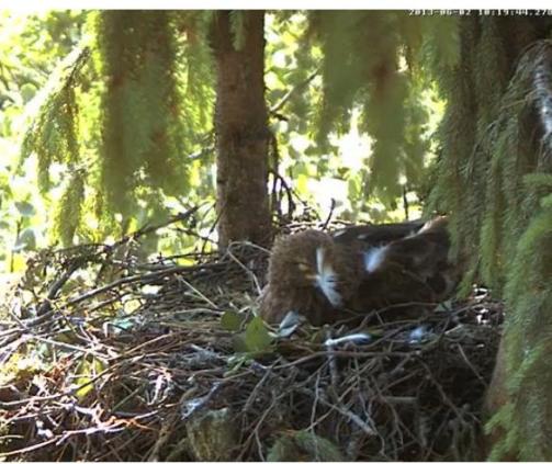 20.20 Mētra prom. Ligzdā vien vīd divas spalvas. Olas glīti piesegtas ar egļu zariņu.