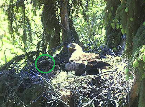 Kad Mētra bija prom, 11.29 ligzdā ielidoja Mačo, apskatīja "savas" olas un ieraudzīja čiekuru. Paņēma to knābī un pārlika uz ligzdas malu kreisajā pusē.