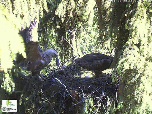 11:30 kamēr sieva mežā, atlido Mačo un sāk sakārtot ligzdu. Fantastiski!! Mačo paņem knābī čiekuru, skatās, kur likt. Paskatās uz olām, saprot, ka tur klāt likt nevar un aiznes uz otru ligzdas malu. Pēc tam sāk bužināt olas, un kārtot zem tām zarus. Tikmēr Mētra netālu laidelējas un satraukti kaut ko dzenā pa mežu. 11:36 Mētra atpakaļ, Mačo nodod stafeti.