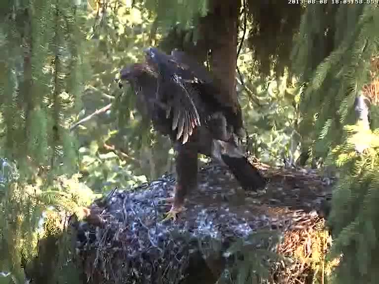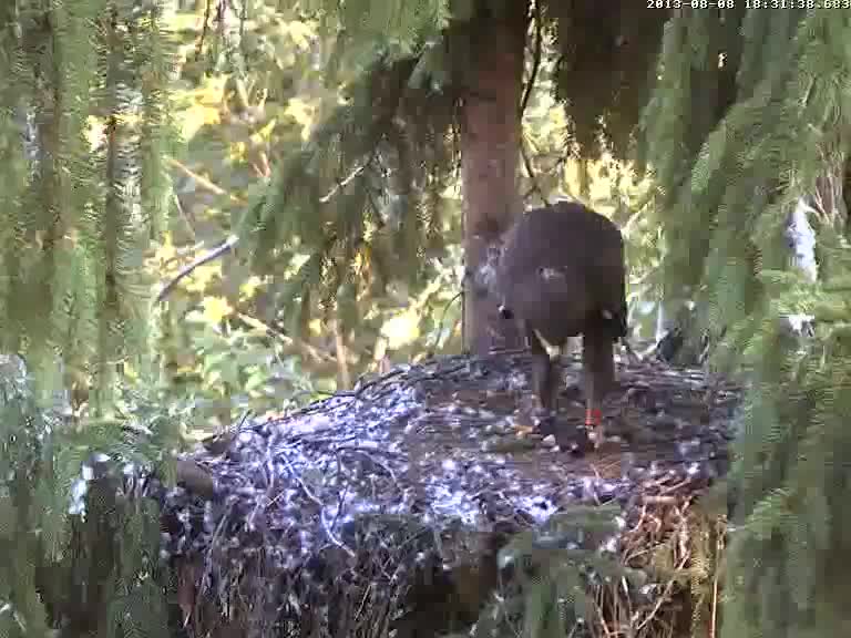 18:05 ligzdā vispirms ielido Mačo ar cienastu, pēc tam ar lielu troksni "iegāžas" arī Mārcis