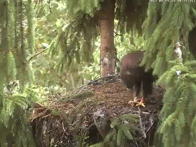 9.35 Mārcis sēdēja uz zara blakus ligzdai un klaigāja, otra balss izklausījās pēc Mačo. Kad papūta vējš, varēja redzēt Mārča plecu, bet bilde nesanāca, laikam nospiedu sekundes desmitdaļu par vēlu. 9.38 Mārča balstele attālinājās.