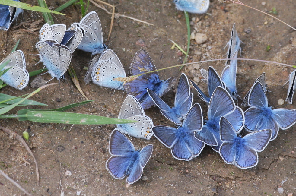 Vīķu zilenītis ir arī viens no lielākajiem - ko gan vieglāk novērtēt, ja blakus sēž citas sugas. Te, piemēram, bilde no šodienas, kur uz zemes sasēdušas un visādus minerāļus uzņem veselas 4 zilenīšu sugas - vīķu zilenīši, zileņu zilenīši, meža zilenītis un sīkais zilenītis. Var pamēģināt viņus visus tur atrast (ja uzspiež uz pievienotās bildes, tad laikam var dabūt redzēt nedaudz lielākā izmērā) :)