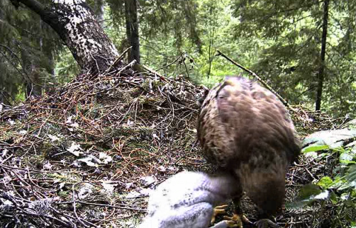 8.30 Tūle ligzdā, Tormi guļ. Ēduši laikam vēl nav, jo divi medījumi redzami ligzdā. Kamēr rakstīju, 8.38 Tūle kliegdama aizlido, mazais palika neēdis! 8.43 atgriezās ar zaru knābī