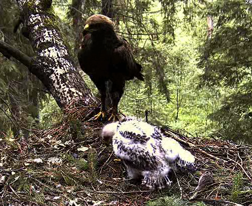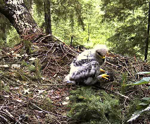 Pievienoju bildi, kura taisīta pagājušā gada 5.augustā, kad Gustei bija tieši 2 mēneši (trīs dienas pirms viņa aizlidoja no ligzdas) un, protams, Guste šajā laikā jau pilnīgi stabili turēja līdzsvaru un pat lidoja no zara uz zaru. Bildē medījumu ir atnesusi Grieta, bet Guste apsegusi ar spārniem sargā ēdienu kamēr to apēd.