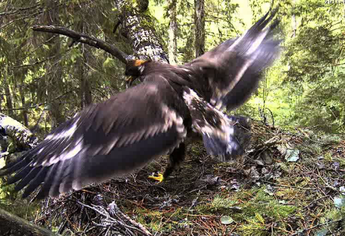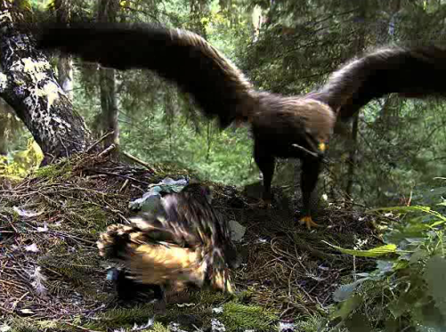 Varbūt, ka sākumā, ja skatās tikai bildes un iepriekš nav skatīti nedaudz lielāki ērglēni, tiešām varēja dažādi saprast šos izplestos spārnus, bet ērglim kļūstot lielākam ir brīnišķīgi redzams, ka ēdiena atnešana notiek pēc vienas shēmas - kad tēvs atnes medījumu ir klupiens ēdienam virsū ar izplestiem spārniem. Kad putns apsedz medījumu ar savu ķermeni, spārni nedaudz tiek sakļauti. Kad tēvs aizlido, putnēns spārnus saliek normālā stāvoklī un ķeras pie ēšanas. Ja medījums neliels un putns stipri izsalcis, medījums tiek norīts laikā, kad spārni atplesti.