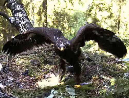 Varbūt, ka sākumā, ja skatās tikai bildes un iepriekš nav skatīti nedaudz lielāki ērglēni, tiešām varēja dažādi saprast šos izplestos spārnus, bet ērglim kļūstot lielākam ir brīnišķīgi redzams, ka ēdiena atnešana notiek pēc vienas shēmas - kad tēvs atnes medījumu ir klupiens ēdienam virsū ar izplestiem spārniem. Kad putns apsedz medījumu ar savu ķermeni, spārni nedaudz tiek sakļauti. Kad tēvs aizlido, putnēns spārnus saliek normālā stāvoklī un ķeras pie ēšanas. Ja medījums neliels un putns stipri izsalcis, medījums tiek norīts laikā, kad spārni atplesti.