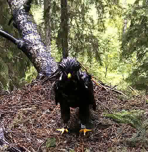 13.00 Tormi visu dienu sēž uz zara, brīžiem varēja redzēt tikai nagu vai spārna spalvu. Vecākus ar ēdienu šodien neesmu redzējusi, laikam medījumi pa alām salīduši lietus dēļ