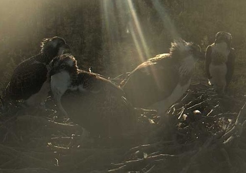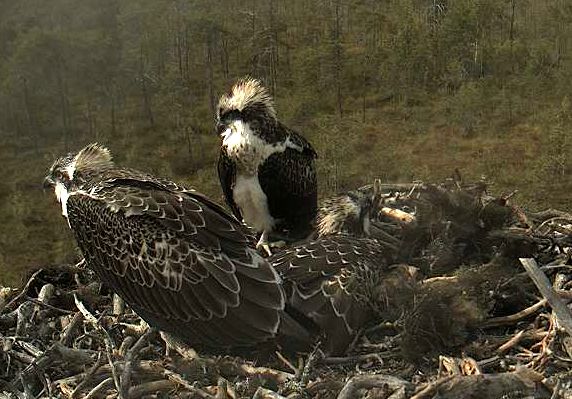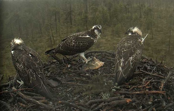 Vakar vakarā vēl vairākkārt slēdzu paskatīties kas notiek zivjērgļu ligzdā. Neilgi pēc kopīgā saieta, kuru piefiksēju iepriekšējā komentārā, visi ērgļi aizlidoja un ligzda ilgāku laiku bija tukša. Divi jaunie atgriezās ligzdā aptuveni ap 23 un palika tur nakšņot.