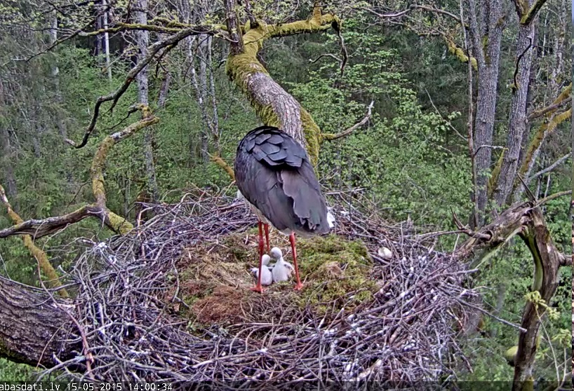 Tikko atvēru kameru- pirmo reizi šodien- un lielais putns stāv kājās un čubina ligzdu. Mazie ņemas pa apakšu. Kakli stārķēniem izskatās garāki, arī knābji paaugušies. Vienam bērnam knābis mainījis krāsu- koši dzeltens kļuvis.