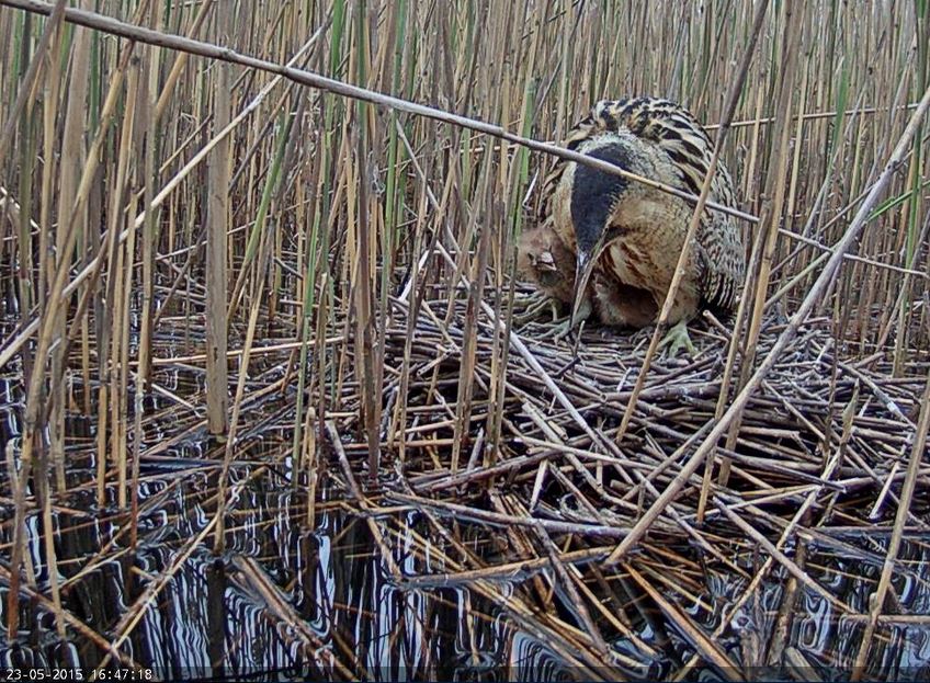 16.59 Mazie gulēja mierīgi, pēkšņi dzirdu: skaļi kurkst, saslējušies stāvus pilnā garumā- īsti dumpju kakli izauguši jau! Ap to laiku debesīs atskanēja vārnas vai kraukļa ķērciens. Pēc dažām sekundēm dumpe iznāk no niedrēm un labu brīdi stāv aiz ligzdas. Viņa tā mierīga nostāvēja 3 minūtes. Labi nomaskējusies- ja es neredzētu, ka viņa ir atgriezusies, domātu, ka ligzdā cāļi vieni paši!