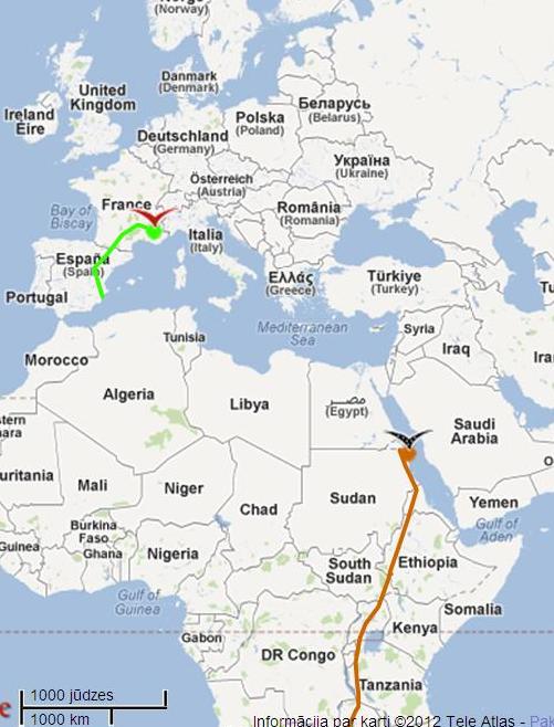 Kartē dati atjaunoti uz 23.martu. Karina šķērsojusi Tanzāniju un 23.martā atradās Ugandā.