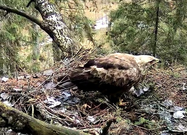 Šorīt ap 9.40 ligzdā ieradās Tūle, uzturējās tur vairāk kā stundu, klaigāja, kārtoja ligzdu.