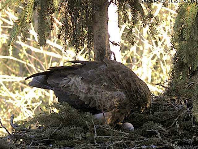 Mačo urda nemiers, 20.15 vēlreiz atlidoja ar zaru. Nolika to uz pašas ligzdas malas un tā kā stiepās apskatīt olu. Mamma uztupās virsū un negribēja, lai Mačo tuvojas. Tā arī nepiegājis tuvāk viņš brīdi pasēdēja un tad aizlidoja.