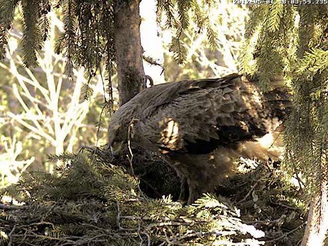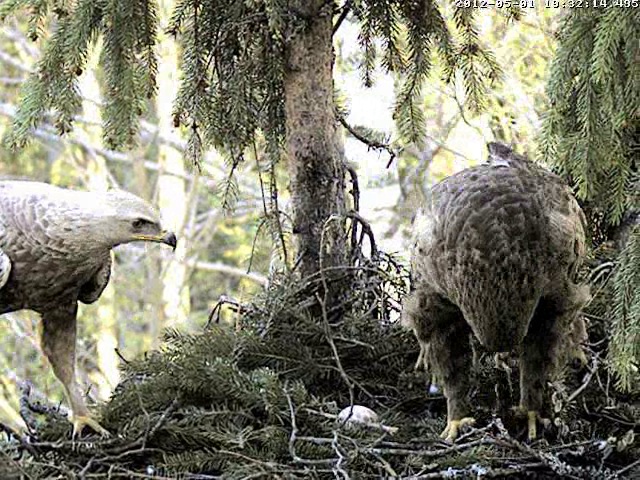 Mačo urda nemiers, 20.15 vēlreiz atlidoja ar zaru. Nolika to uz pašas ligzdas malas un tā kā stiepās apskatīt olu. Mamma uztupās virsū un negribēja, lai Mačo tuvojas. Tā arī nepiegājis tuvāk viņš brīdi pasēdēja un tad aizlidoja.