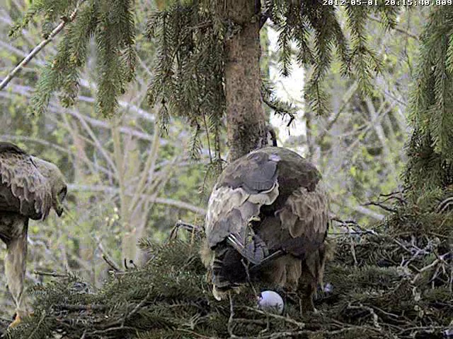 Mačo urda nemiers, 20.15 vēlreiz atlidoja ar zaru. Nolika to uz pašas ligzdas malas un tā kā stiepās apskatīt olu. Mamma uztupās virsū un negribēja, lai Mačo tuvojas. Tā arī nepiegājis tuvāk viņš brīdi pasēdēja un tad aizlidoja.