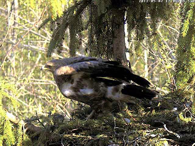 (lai gan joprojām esmu gandrīz pārliecināta, ka tā nav Mētra. Radušies vēl daži jautājumi - kāpēc mamma šogad nelaida Mačo pie olas, bet pērn abas reizes laida un skrubinājās ar viņu ar knābjiem? Kāpēc šogad viņa vienmēr medījumu ēd ligzdā lēni raustot, bet pērn nekad tā nedarīja? (mazos rija veselus, lielos lidoja ēst ārpus ligzdas) Kāpēc viņa šogad ne reizi nav ieņēmusi savu pagājušā gada iemīļoto pozu izstiepjot galvu uz priekšu? Un galvenais, kur palikušas tās trīs spalvas pie astes, kuras tur pagāšgad bija?(pie kam Mačo visas spalvas ir palikušas nemainīgas) Man nav atbildes uz šiem jautājumiem, esmu sagatavojusi salīdzinošas bildes līdzīgos rakursos un ļoti gaidu kad Uģis atgriezīsies no ekspedīcijas un izteiks savu spriedumu.)