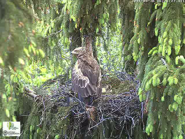 9:36 - 9:43 Mētra bija izlidojusi no ligzdas. Viss sākās ar viņas saucienu skanējuma izmaiņu uz augstākiem un garākiem toņiem; it kā skatījās kaut kur augšup, tad piecēlās kājās un spārnus tāpat neatlocītus nedaudz patirināja (zīmējās?). Tad aizlēca uz blakus zaru ārpus kadra, kādu brīdi tur patupēja, pabļāva, pēc tam aizlaidās prom. Mačo ligzdā netika manīts.