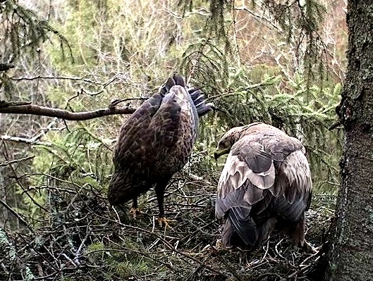 Redzēju abus ap 9.40, pirmajā bildē Koits sēž kokā netālu no ligzdas, centrā, pašā augšā.