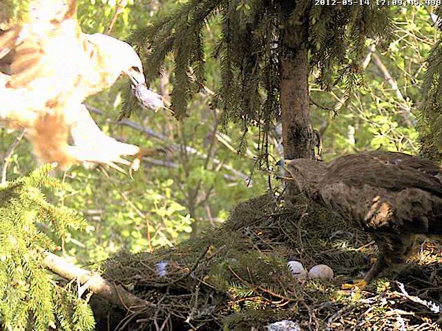 12:39 atlidoja Mačo, diemžēl neredzēju vai ko atnesa, bet Mētra viņam izskrēja tālu pretīm. Mētra uzreiz aizlidoja, Mačo ielēca ligzdā un čubināja oliņas, Mētra pēc 2 min atgriezās. (kad atlidoja Mačo, pārraide bija īpaši saraustīta)