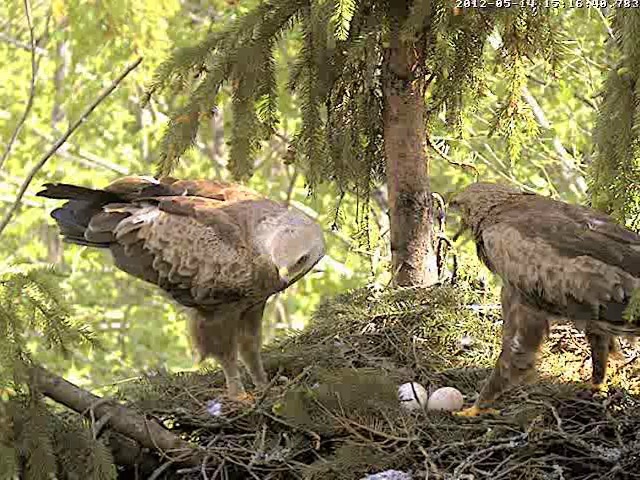 12:39 atlidoja Mačo, diemžēl neredzēju vai ko atnesa, bet Mētra viņam izskrēja tālu pretīm. Mētra uzreiz aizlidoja, Mačo ielēca ligzdā un čubināja oliņas, Mētra pēc 2 min atgriezās. (kad atlidoja Mačo, pārraide bija īpaši saraustīta)