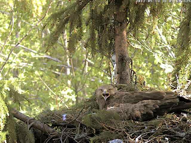 12:39 atlidoja Mačo, diemžēl neredzēju vai ko atnesa, bet Mētra viņam izskrēja tālu pretīm. Mētra uzreiz aizlidoja, Mačo ielēca ligzdā un čubināja oliņas, Mētra pēc 2 min atgriezās. (kad atlidoja Mačo, pārraide bija īpaši saraustīta)