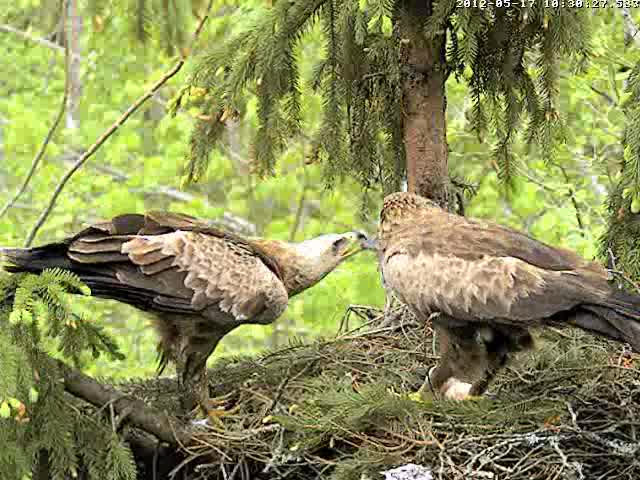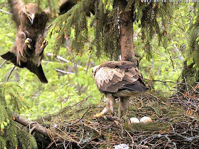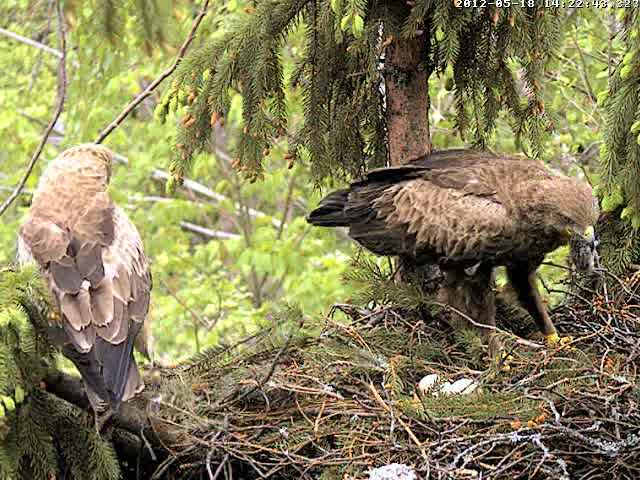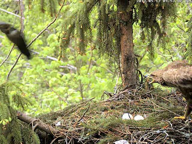 12:57 Mētra atpakaļ ar egles zariņu. Ielocīja gar olām, un uzreiz apgulās perēt. Auksts gan.