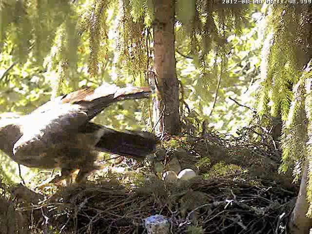17:57 Mētra atpakaļ ar zariņu. Iestūma ligzdā un uzvēla virsū olas.