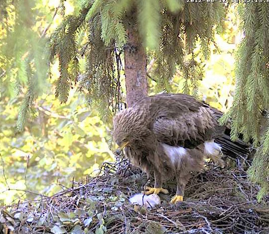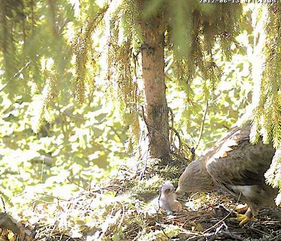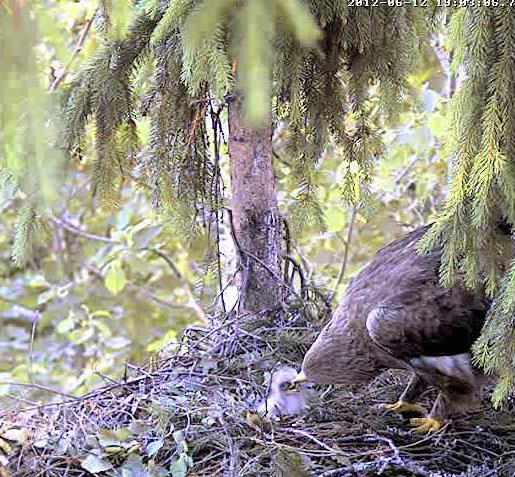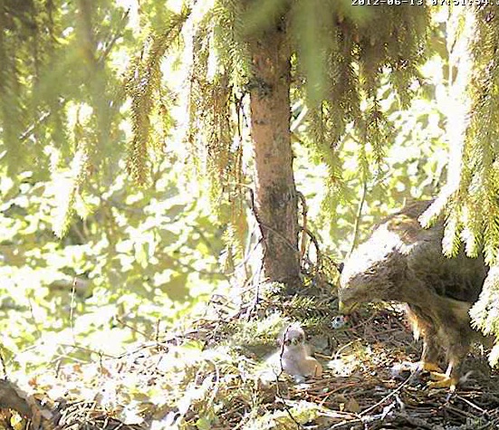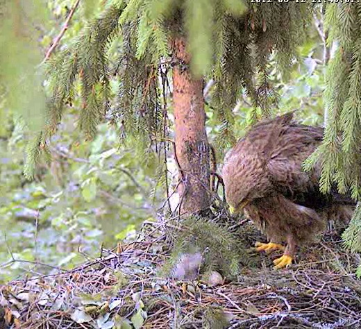 Ieslēdzu 7.50, Mētra turēja knābī peli un izskatījās, ka tā ir nupat atnesta. Tad Mētra sāka barot sīci. p.s. Šorīt mazulis izšķīlās arī Ehai. Šogad bagāts gads, visās ligzdās ērglēni