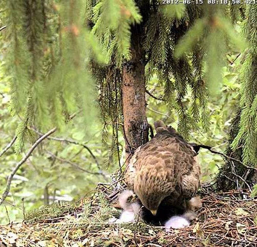 8.18 Mētra knosās. Kains (kreisajā pusē) aktīvi skatās uz mammu, Ābels sākumā nekustējās neskatoties uz Mētras rosīšanos, kad viņa mēģināja dabūt mazo zem sevis, drusku pakustējās, bet tāpat palika gulēt ar galvu uz ligzdas bedrītes malas.