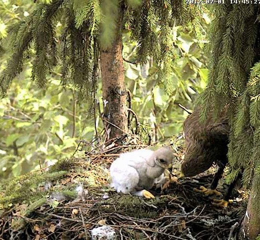 11.00 Mētra aizlidoja pirms 10, mazais viens pats laiskojās ligzdā. Mētra ir turpat blakus (ne uz zara, bet tālāk), ik pa laikam klaigā no meža. Laikam medī vardes tuvējā grāvī :D