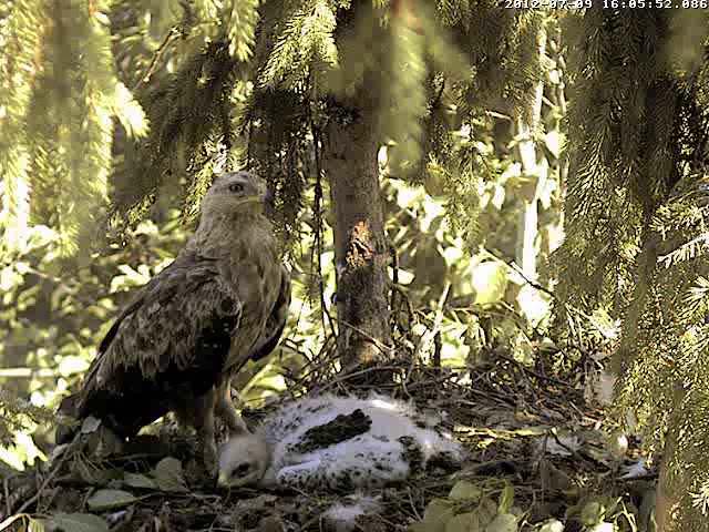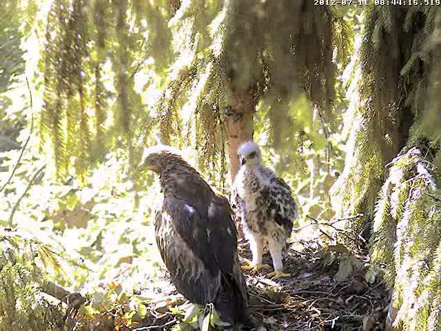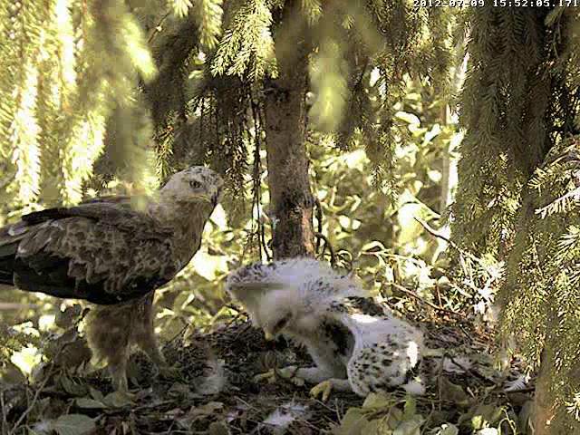 9:48 Mačo atnesa Mikam kurmi, Miks veikli saķēra medījumu un griezās pret tēvu ar muguru, tad saprata, ka tētis nekur nesteidzas, kādu brīdi sargādams staipīja kurmi pa ligzdu, līdz beidzot uzsēdās ar tam virsū, bet ar skatu pret tēvu. Skatijos tikai ~20 min, Mačo tā arī palika ligzdā.