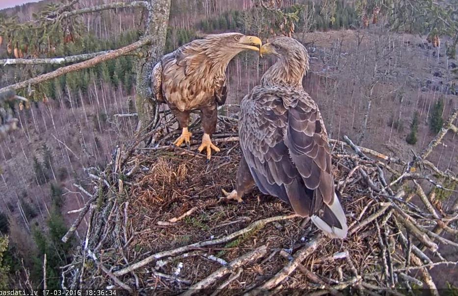 6:28 atlaižas ērgļi: viens ligzdā, otrs aiz ligzdas.