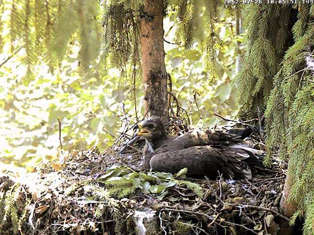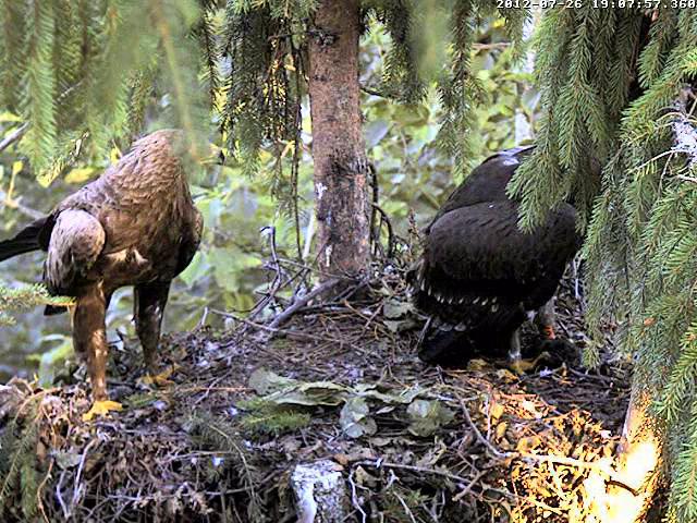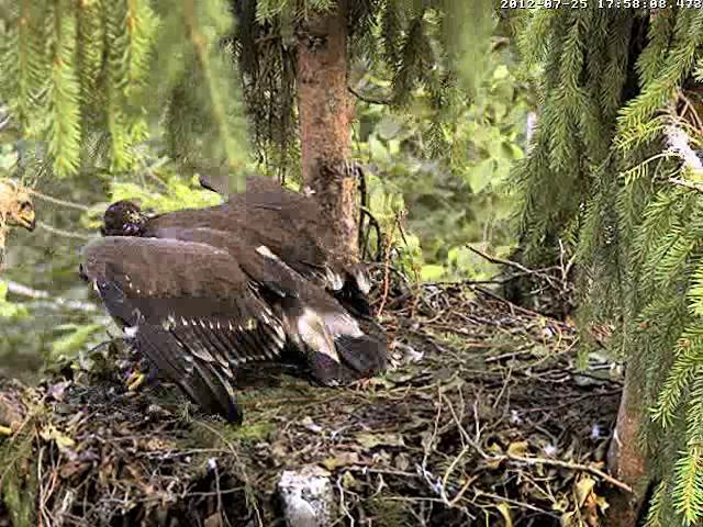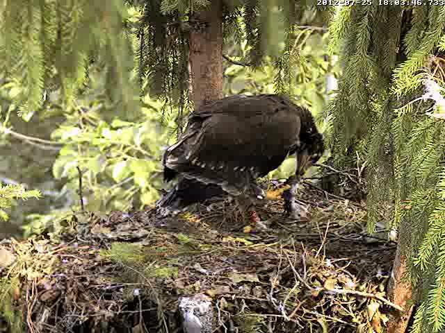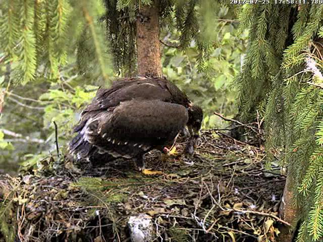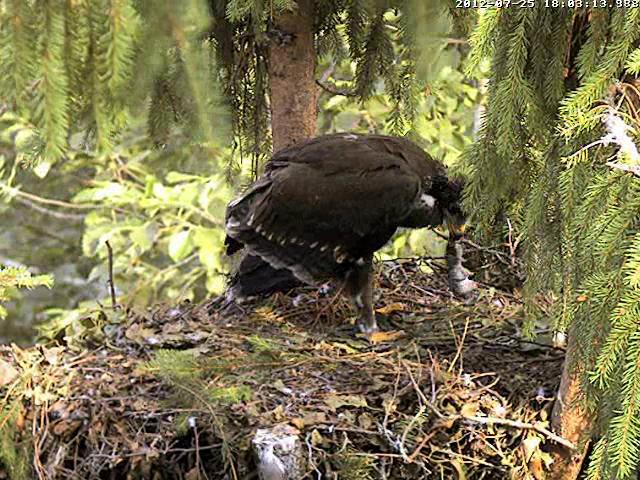 Kameru ieslēdza neilgi pirms 8. Kamēr grozījos pa virtuvi, dzirdēju, ka Mačo pielidoja (ap 8.03) un kaut ko atnesa, jo Miks klaigāja pa visu mežu, bet pašu nodošanas brīdi neredzēju. Nu jau minūtes 25 Miks to plosa un joprojām nevaru saprast kas tas ir. Pēc izmēra kā zebiekste, bet izskatās kā gaļas gabals bez ādas. 8.31 viņš norija pēdējo gabalu.