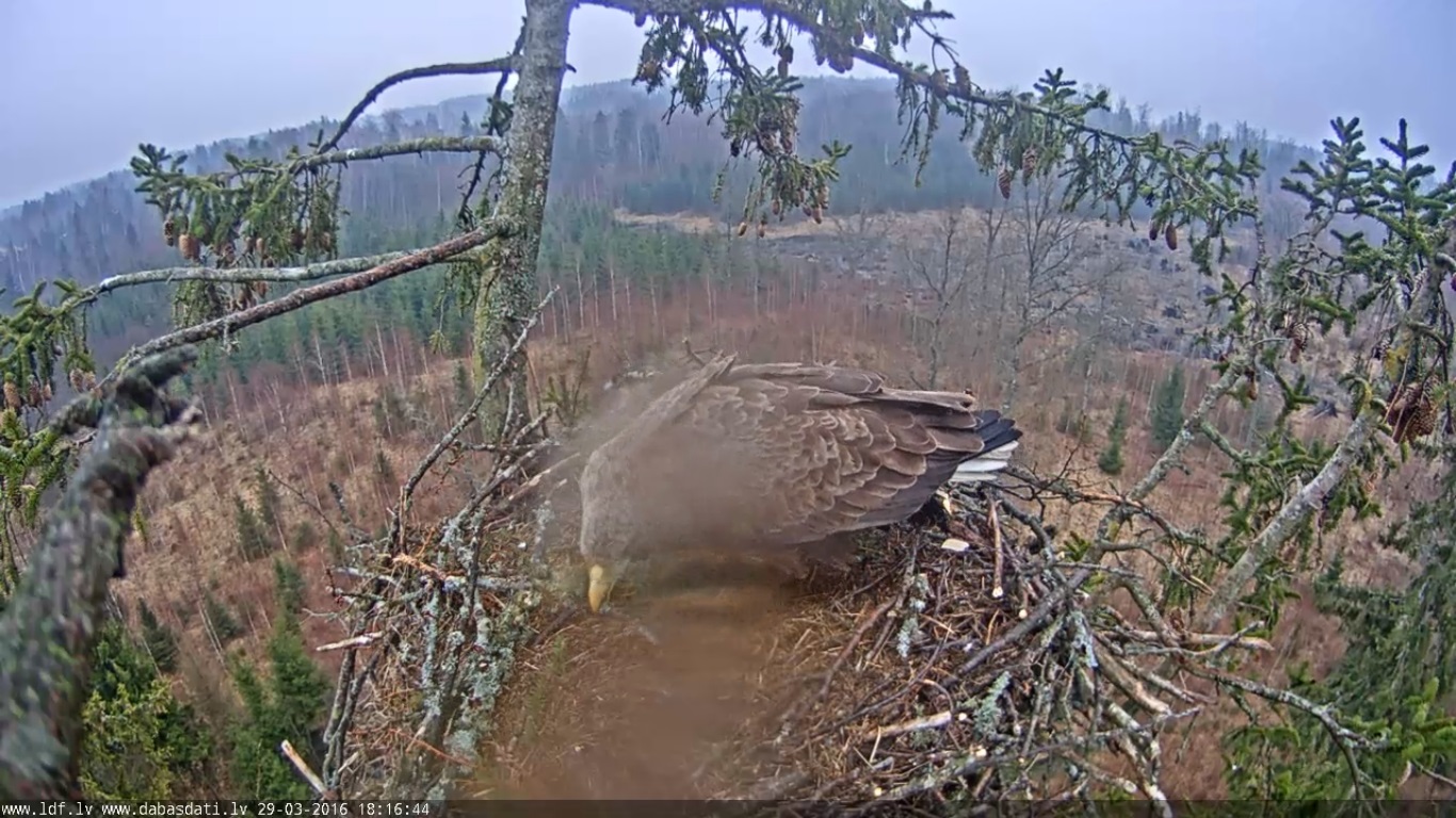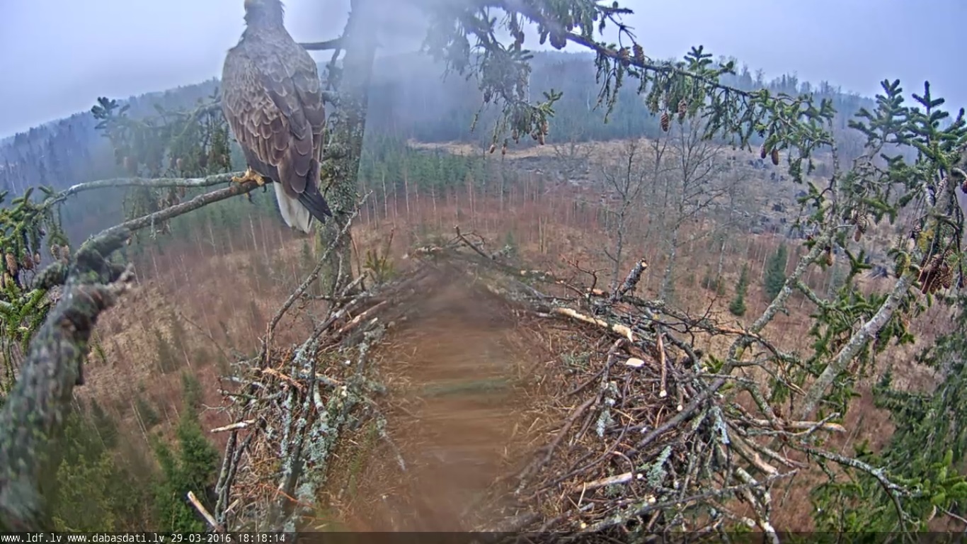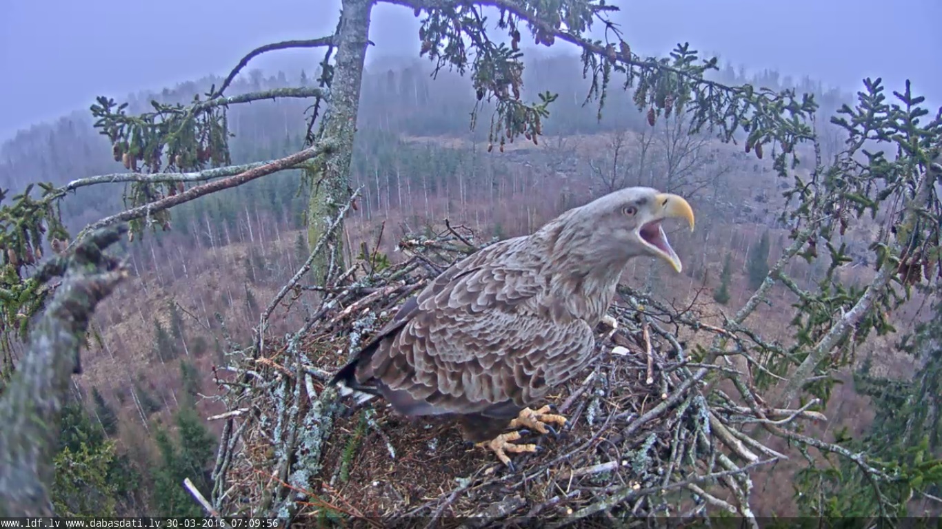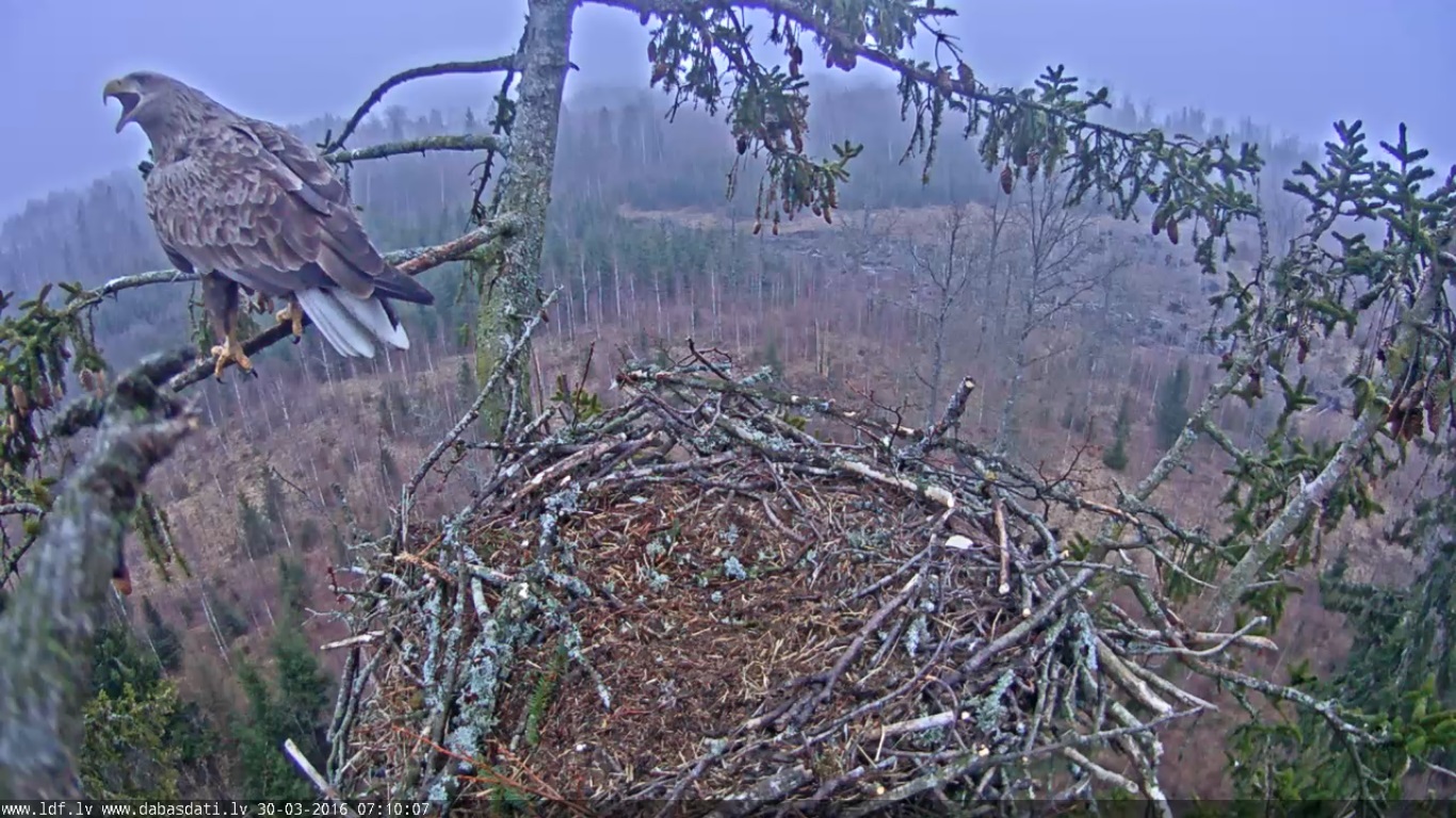 No 7:09-7:12 Ansis ligzdā un zarā--sauc,kā traks--Egle turpat tuvumā,bet nerādās un arī sauc---kaut kāda traka bļaušana šorīt mūsu ērgļu pārim: