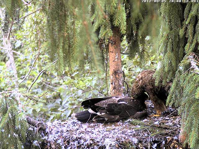 Pirms 20 minūtem no ligzdas izkrita igauņu ērglīte Stefa! Ieslēdzu kameru 8.09, atkal bija vistu vanaga uzbrukums, viņa nenoturēja līdzsvaru un izkrita! Igauņu forumu informēju, tur neviena cita nebija pie kameras tajā brīdī. Esmu ļoti satraukta, kas tagad notiks ar ērglīti???
