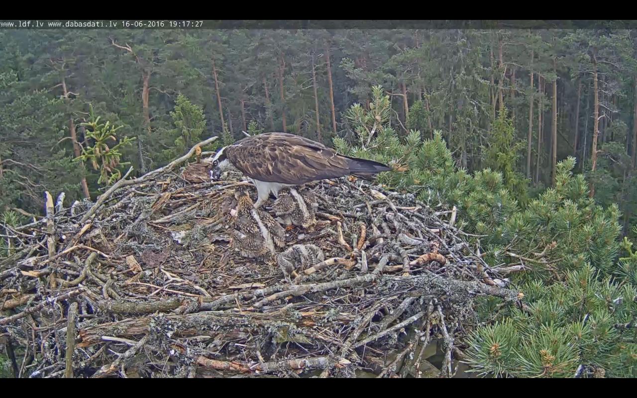 19:09 divi guļ, pieplakuši ligzdai un galvu ierāvuši, bet stiprākais barojas. Ja kāds mēģina izsliet galvu, tad tūlīt atkal dabū knābienu skaustā. Zivs vēl spirinās.