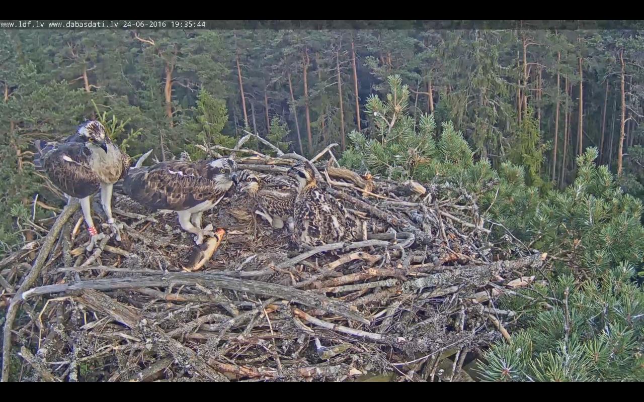 9:10 atlido Jumis ar sūnu kušķi, pārkārto zarus ligzdā un pēc brītiņa aizlido.