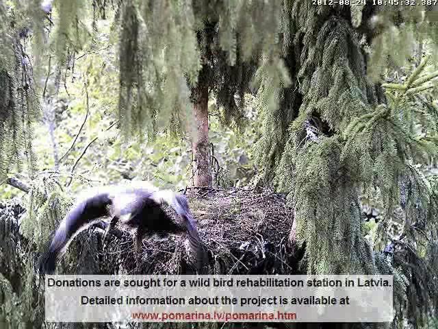13:53 piebraucu pie darba- pa atvērto logu dzirdu , ka mežā liels tracis! Ienācu iekšā- skatos- Miks ligzdā, bet viens no lielajiem mežā klaigā. Tad 13:57 lielais ērglis brēkādams nolidoja garām Mikam,šis nabadziņš, ligzdā aiz pārsteiguma apklusa.Vēlāk devās uz zaru, kur turpina čiepstēšanu.Mežā dzirdama lielā ērgļa balss, kas attālinās...