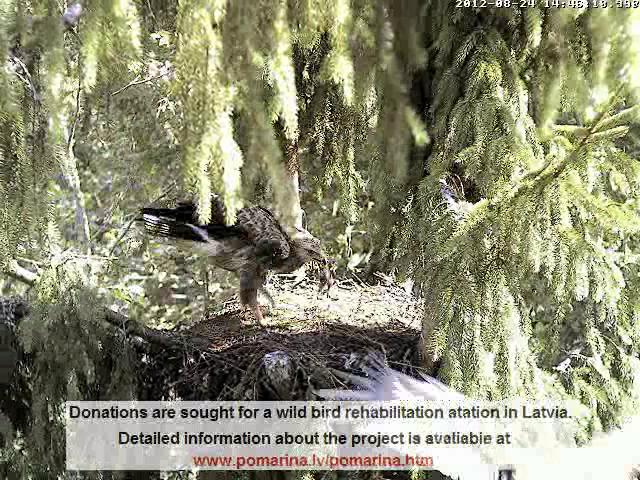 13:53 Mētra atnesa medījumu. Sauc Miku. Mīlulītis klāt, un abi kaut ko skaļi pārrunā. Mētra prom uz zaru, Miks ligzdā abi izteiksmīgi tērgā.